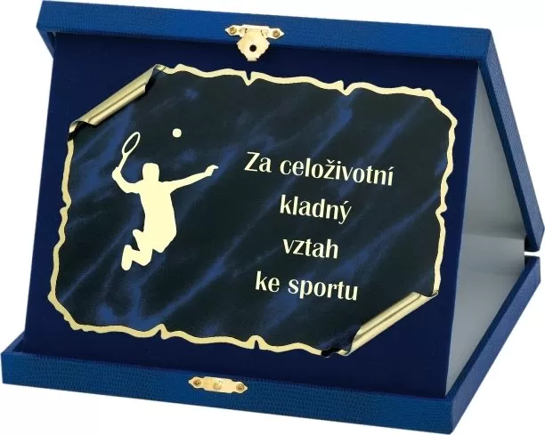 Sportovní plaketa v etui modré barvy s možností laserového gravírování v ceně.