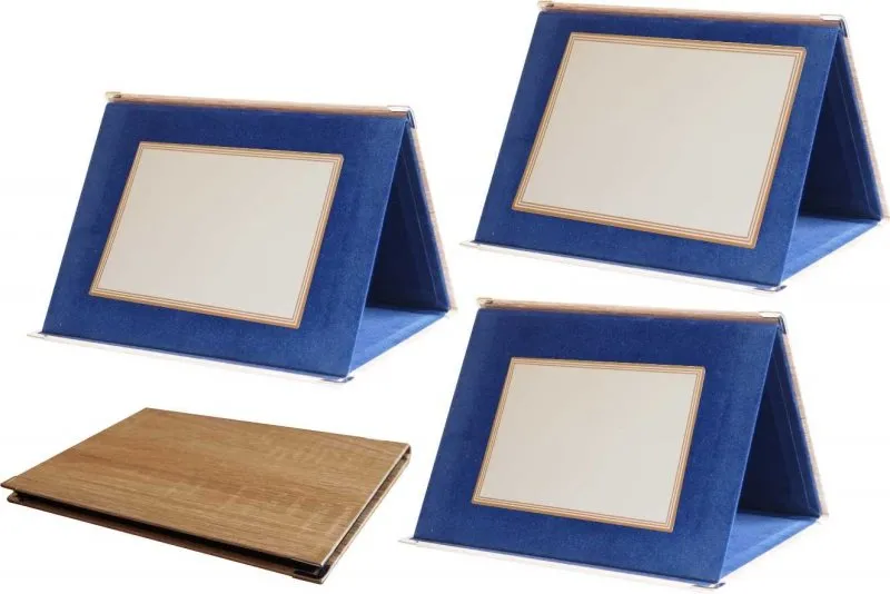 Sportovní plaketa v etui z imitace dřeva, vnitřek modré barvy s kovovou plaketou stříbrné barvy s možností laserového gravírování nebo potisku v ceně.