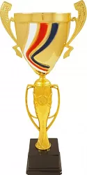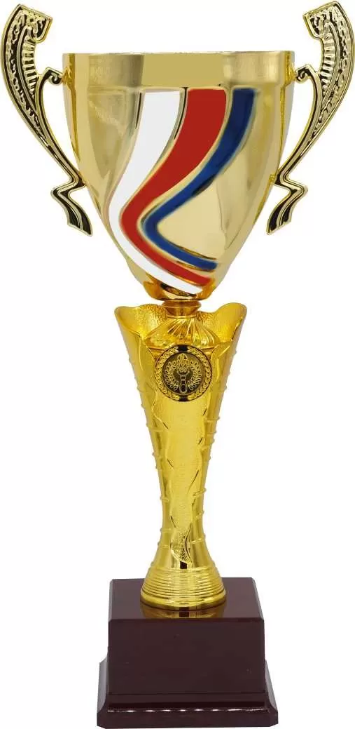 Sportovní luxusní pohár s možností emblému 2,5 cm, poklice a štítku na hnědém plastovém podstavci. Pohár v barvě české trikolóry.