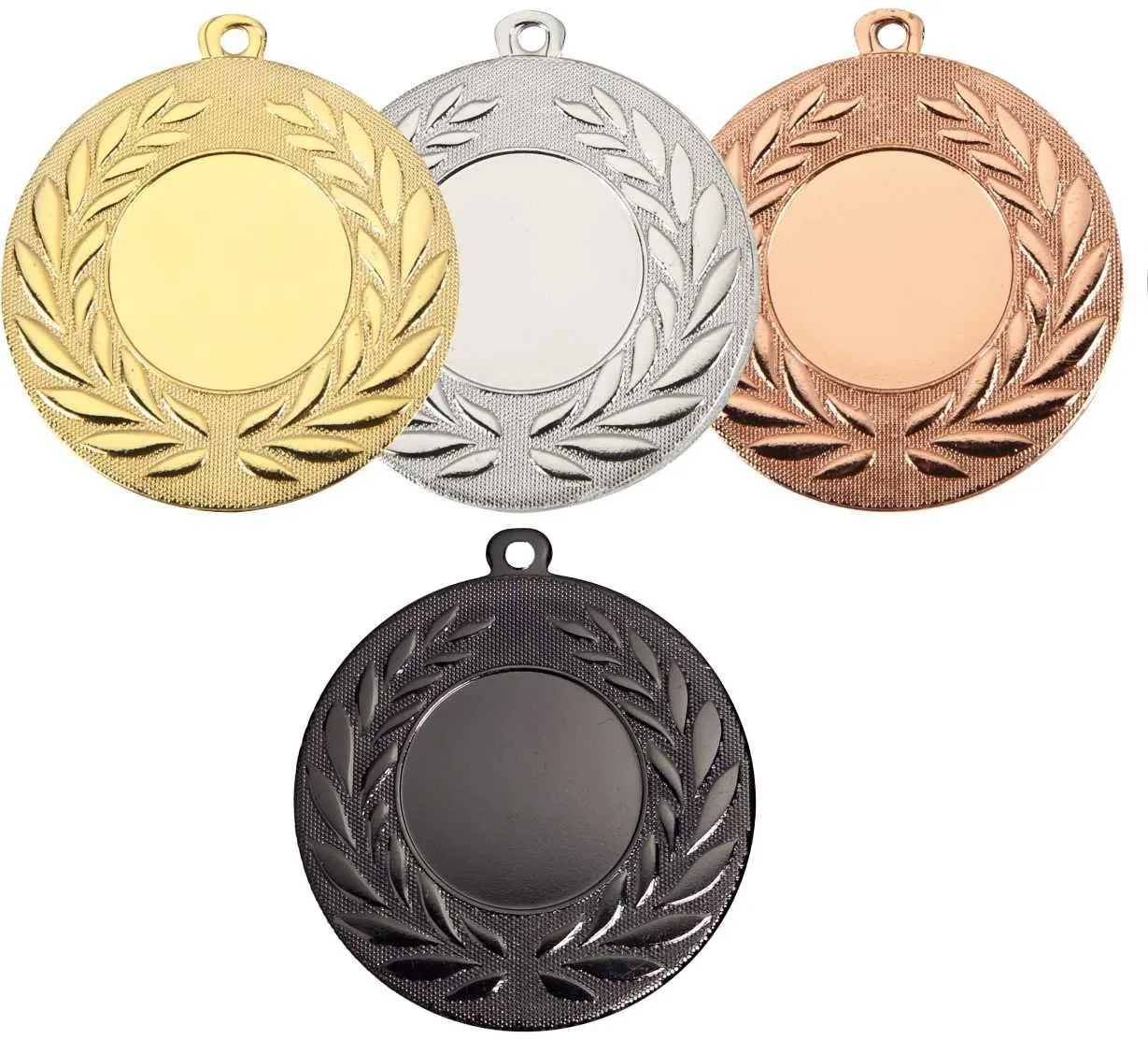 Sportovní kovová medaile v provedení zlato, stříbro a bronz a navíc je zde další varianta barvy pro další umístění nebo se hodí jako účastnická medaile v barvě tmavého metalu. Na přední stranu lze vložit emblém 2,5 cm a na zdaní stranu 4,5 cm. K medailím lze vybrat libovolnou barevnou stuhu.