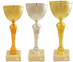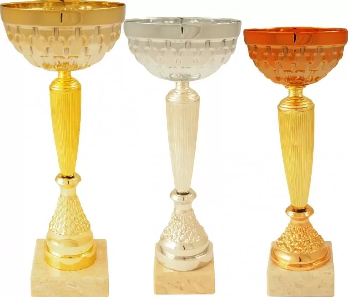Pohár dostupný ve zlaté, stříbrné a bronzové variantě s texturovaným kalichem a rýhovanou nožkou. Diamantový vzor na kalichu a dekorativní základna charakterizují design. Mramorový podstavec dodává reprezentativní vzhled.