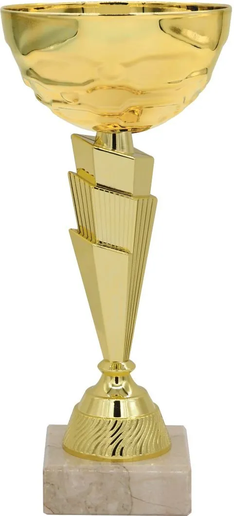 Sportovní pohár s možností štítku a poklice na mramorovém podstavci ve zlatém provedení.
