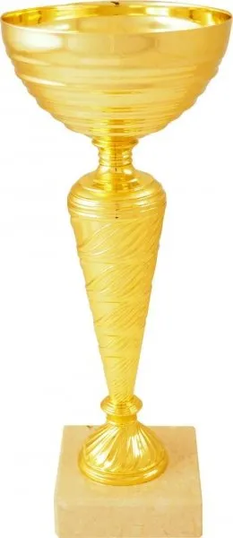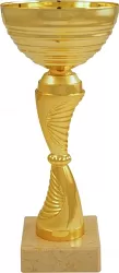 Pohár s hladkým kalichem a spirálově texturovanou nožkou ve zlatém provedení. Šikmé linie na nožce vytvářejí dynamický vizuální efekt. Kompaktní rozměry a mramorový podstavec činí trofej univerzální volbou.