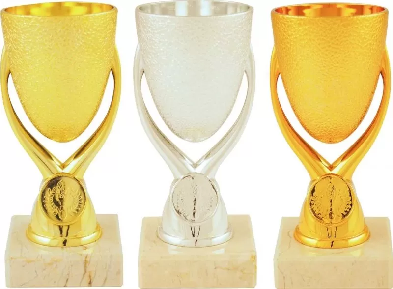 Sportovní pohár v provedení zlato, stříbro a bronz s možností emblému 2,5 cm a štítku na mramorovém podstavci.