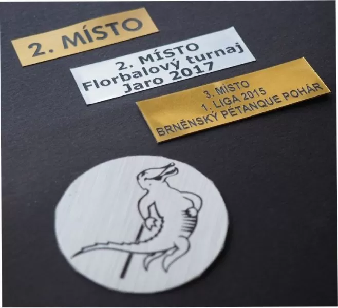 Štítek laserový v provedení zlato,stříbro,bronz. Po vypálení textu nebo loga laserem je barva písma, loga černá.