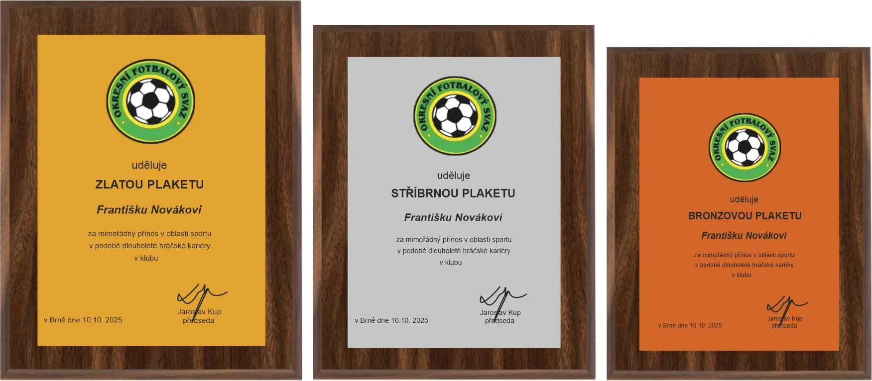 Plaketa dřevěná v provední zlato, stříbro a bronz, plast s možností barevného potisku.