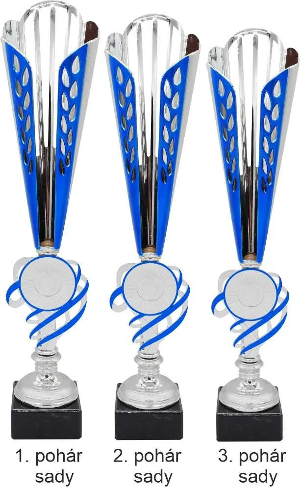 Sportovní ekonomická sada třech pohárů s možností emblému 2,5 cm a štítku na černém mramorovém podstavci. Sada je ve stříbrno-modrém provedení.
