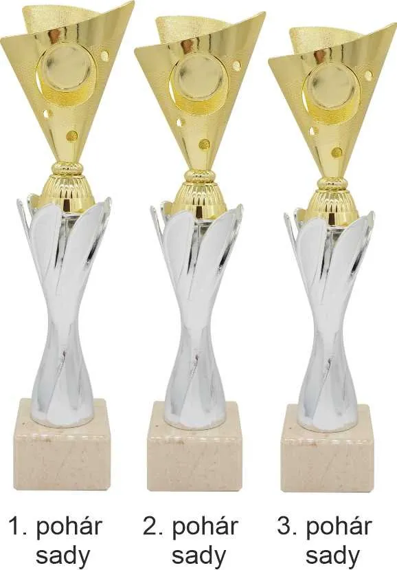 Sportovní ekonomická sada třech pohárů s možností emblému 2,5 cm a štítku na mramorovém podstavci. Ekonomická sada pohárů je ve zlato-stříbrném provedení.