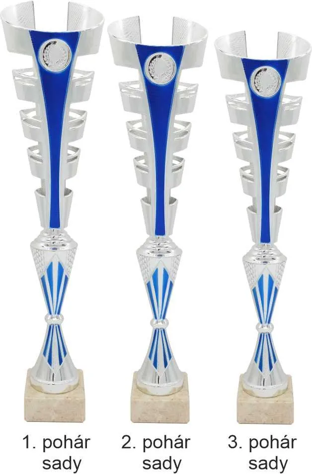Sportovní ekonomická sada třech pohárů s možností emblému 2,5 cm a štítku na mramorovém podstavci. Sada je ve stříbrno-modrém provedení.