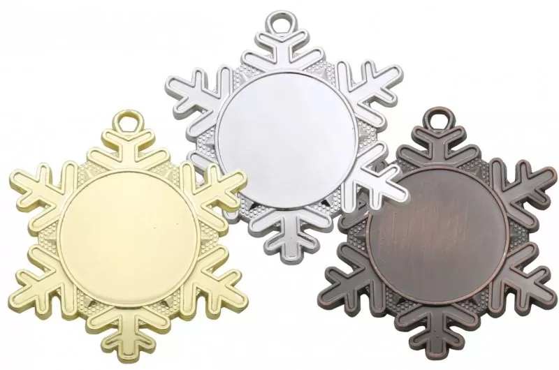 Sportovní medaile ve zlatém, stříbrném a bronzovém provedení sněhové vločky s možností libovolné stuhy a emblému na přední stranu 2,5 cm,zadní stranu 3 cm.