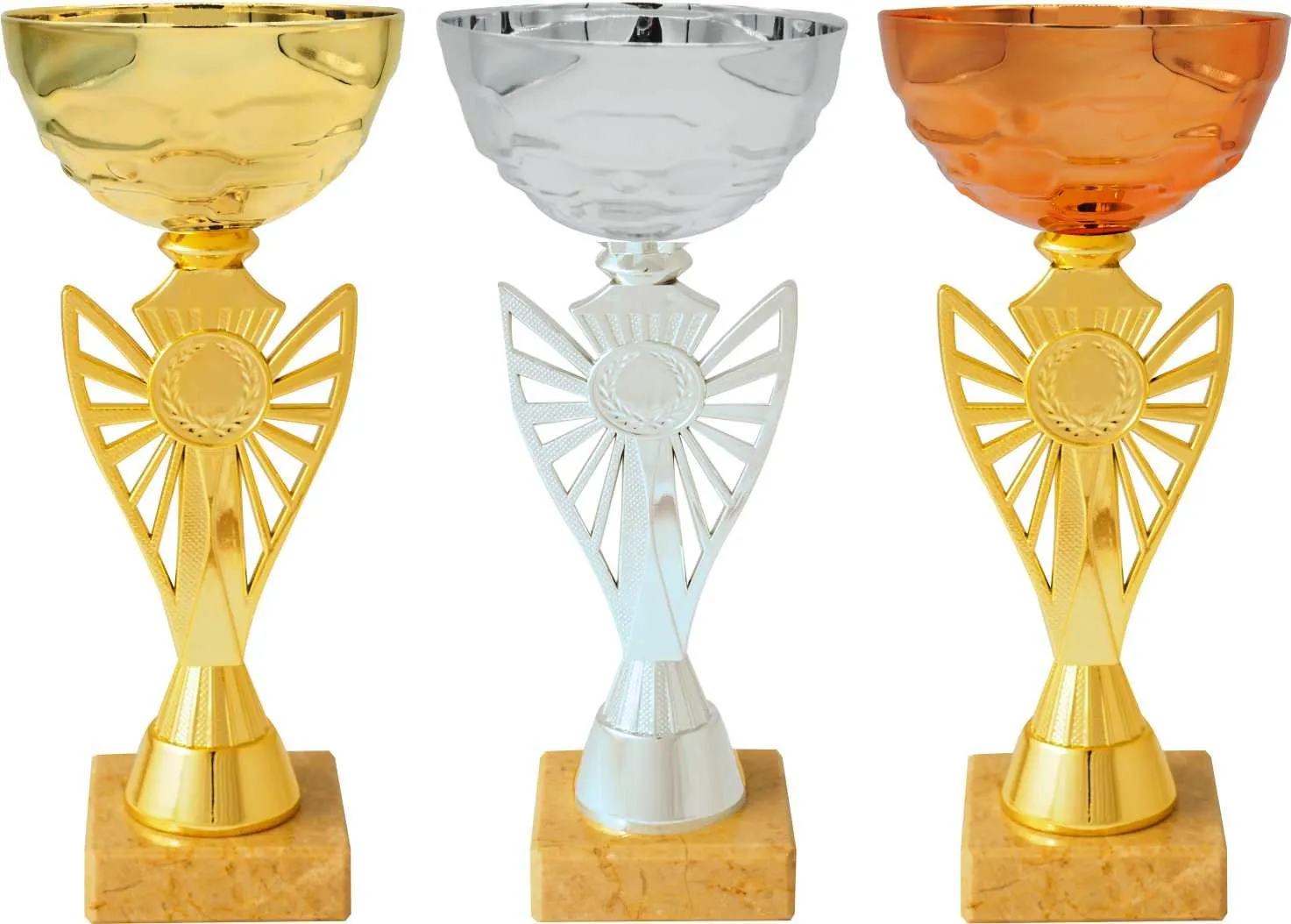 Sportovní pohár s možností emblému 2,5 cm, poklice a štítku na mramorovém podstavci ve zlatém, stříbrném a bronzovém provedení.