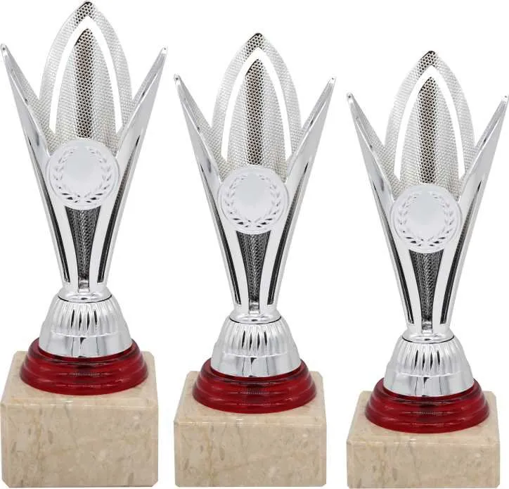 Sportovní pohár ve stříbrném provedení s červeným doplňkem. Na pohár lze umístit emblém 2,5 cm a štítek. Pohár je na mramorovém podstavci.