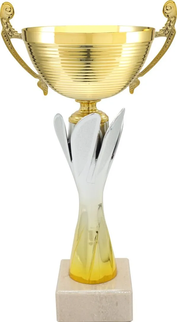 Sportovní pohár s možností poklice a štítku na mramorovém podtavci ve zlato/stříbrném provedení.
