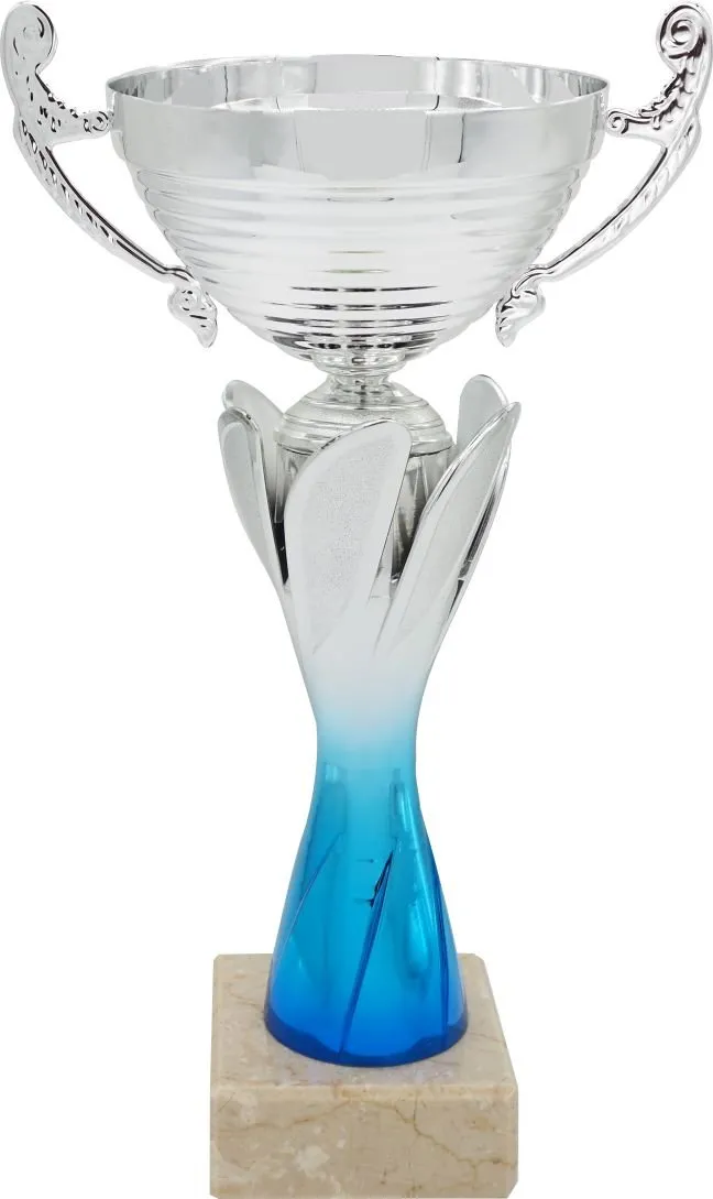 Sportovní pohár s možností poklice a štítku na mramorovém podstavci ve stříbrno/modrém provedení.