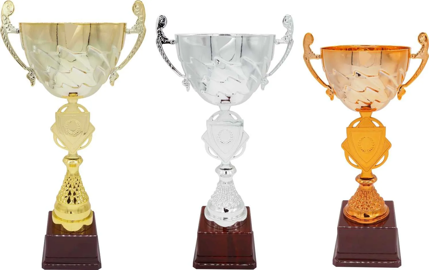 Sportovní pohár s možností emblému 2,5cm, poklice a štítku na hnědém plastovém podstavci v provedení zlato, stříbro a bronz.